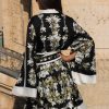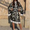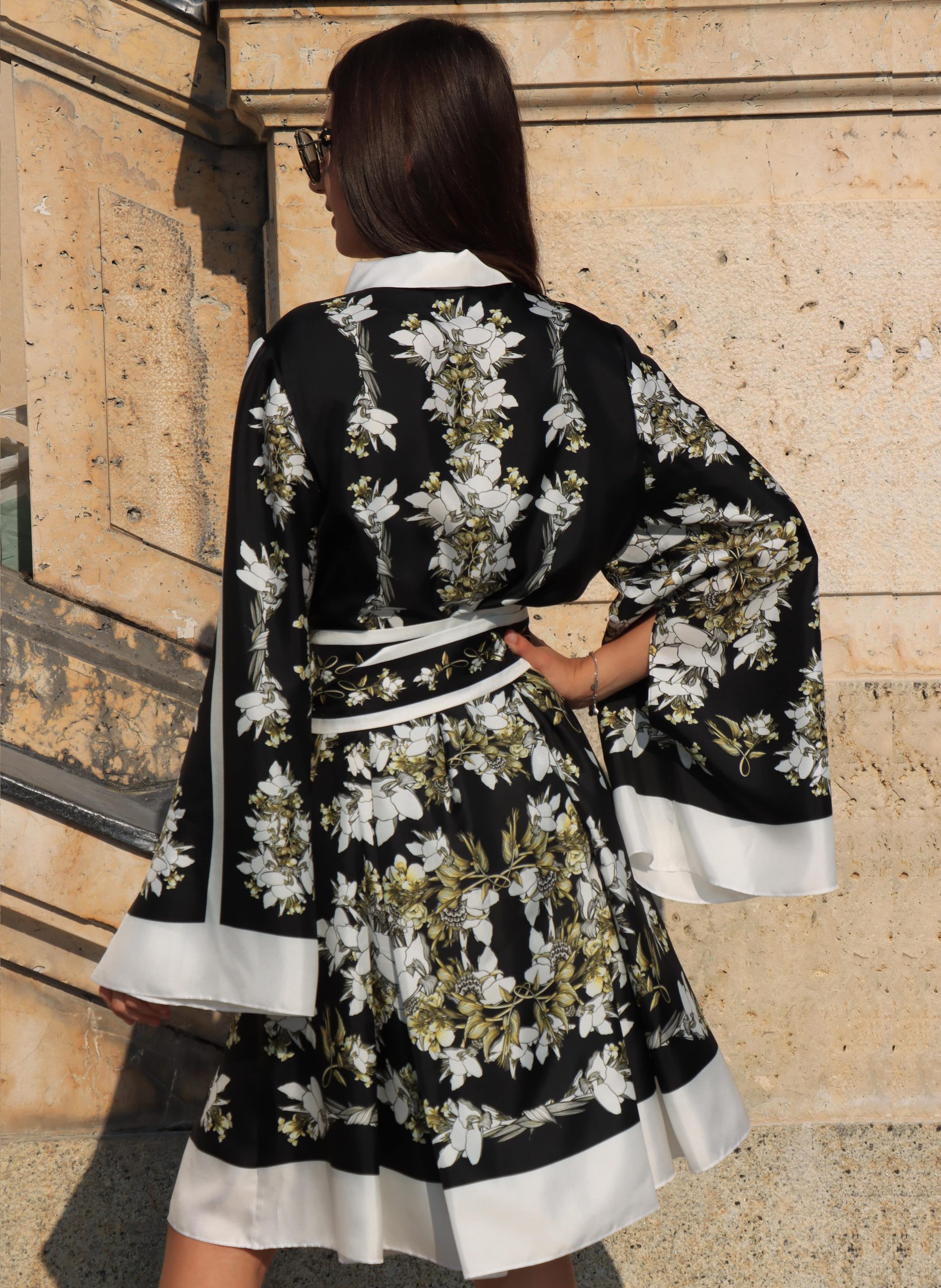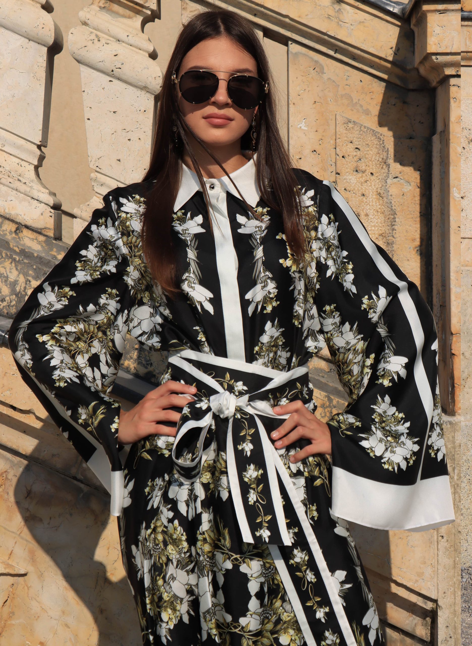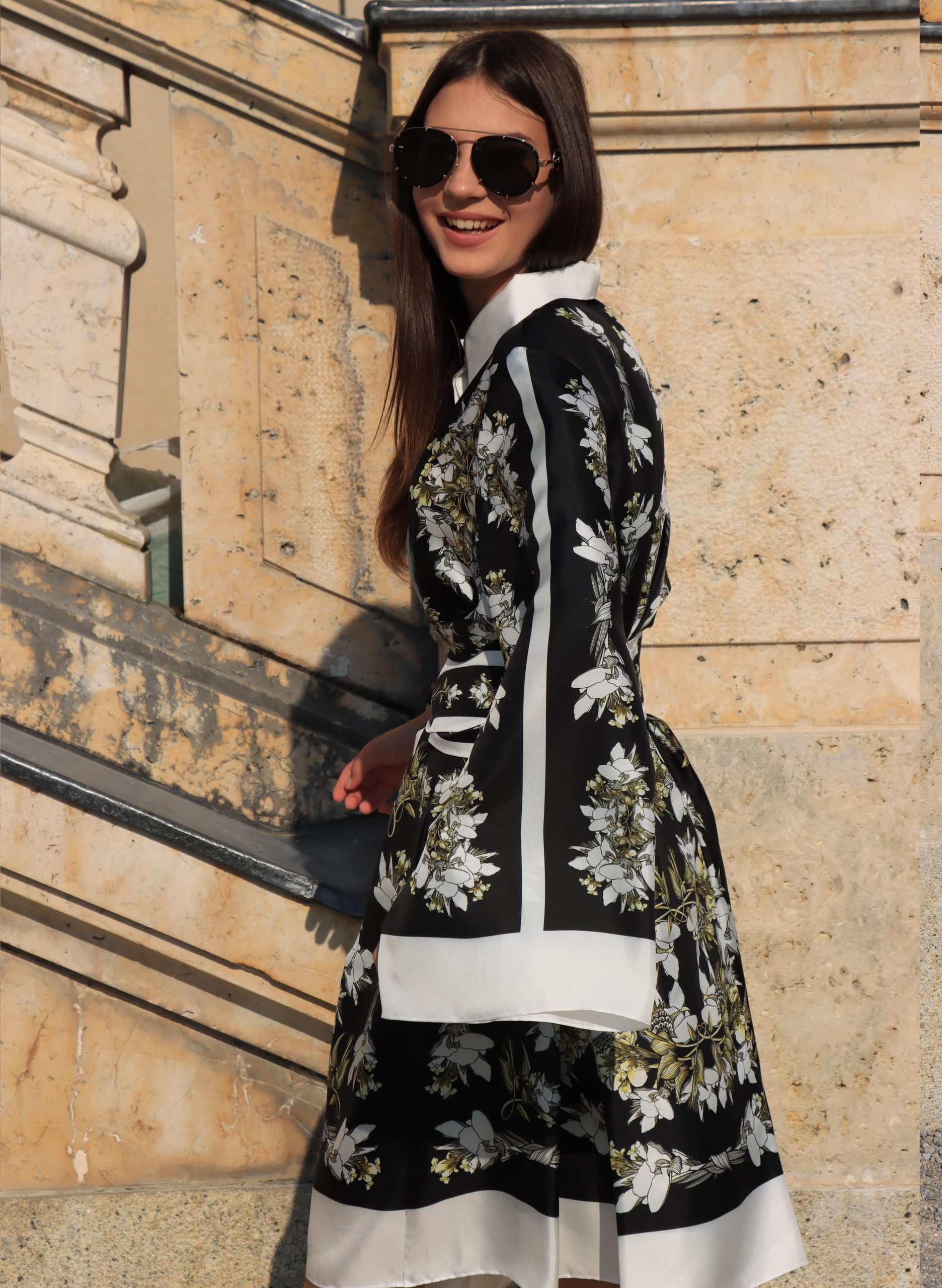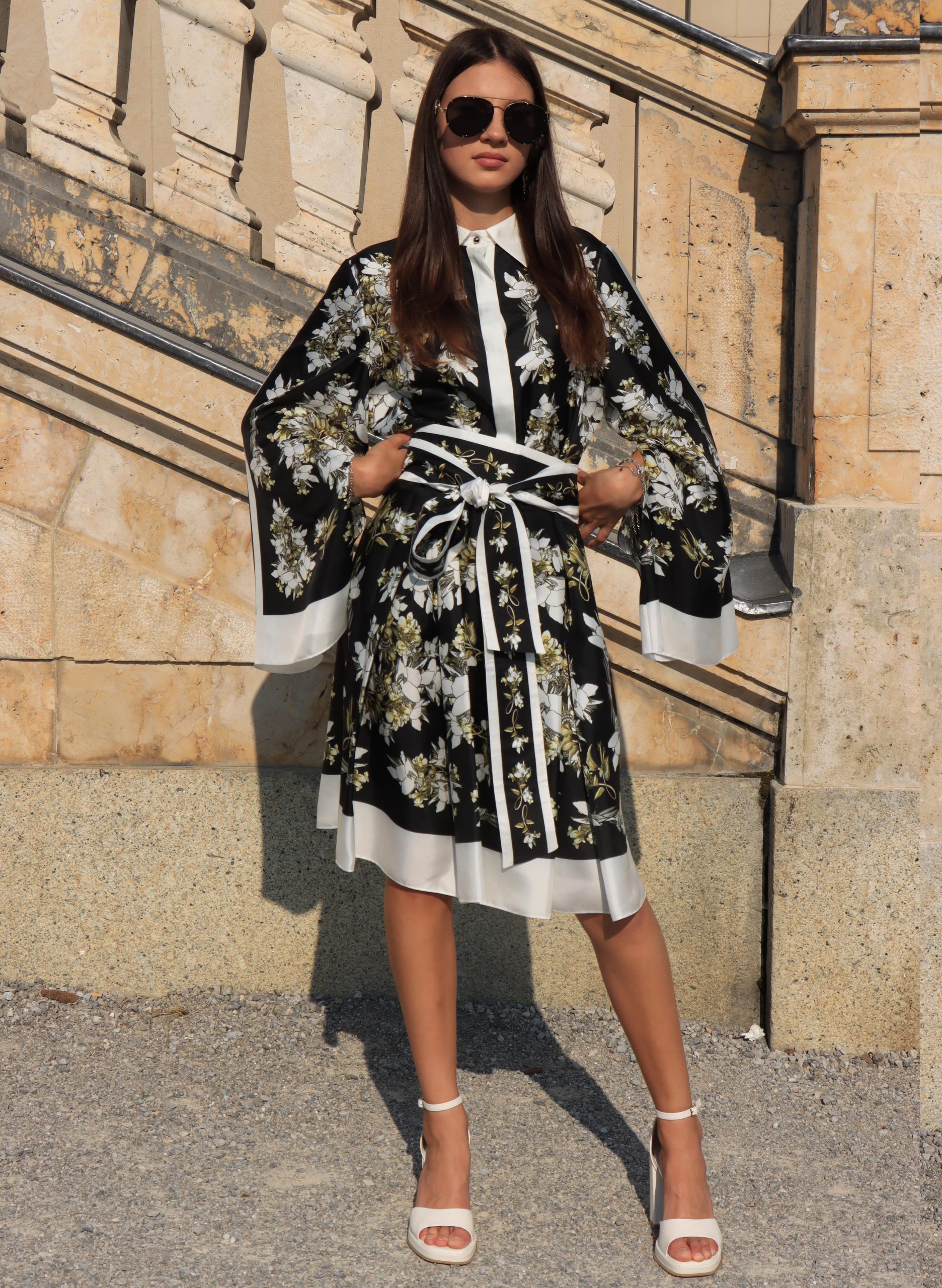 An elegant collar and a belt gently highlight the waist, adding sophistication and poise, while the wide, kimono-style sleeves become the standout detail. This dress is sure to turn heads and become the centerpiece of any wardrobe.