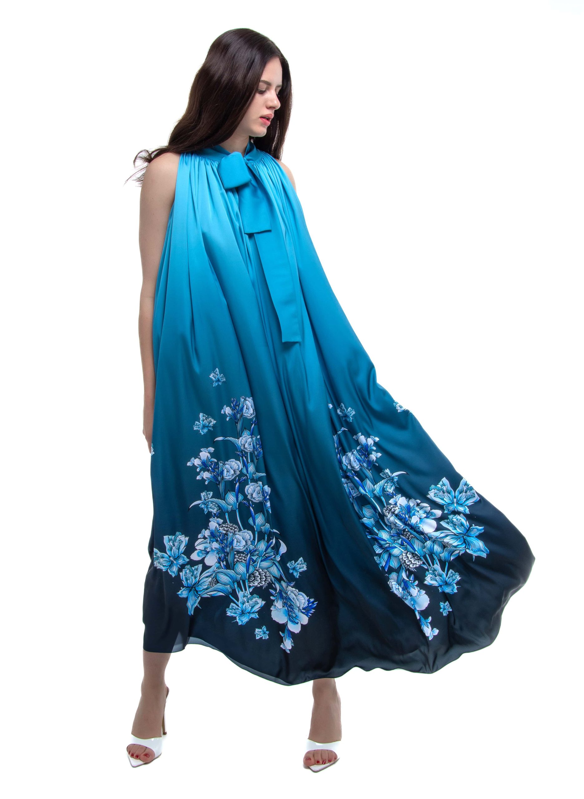 Set against a rich blue gradient, the exclusive floral print from our Flower Garden collection looks especially vivid and festive. The combination of color, movement, and detail makes this dress truly unforgettable.