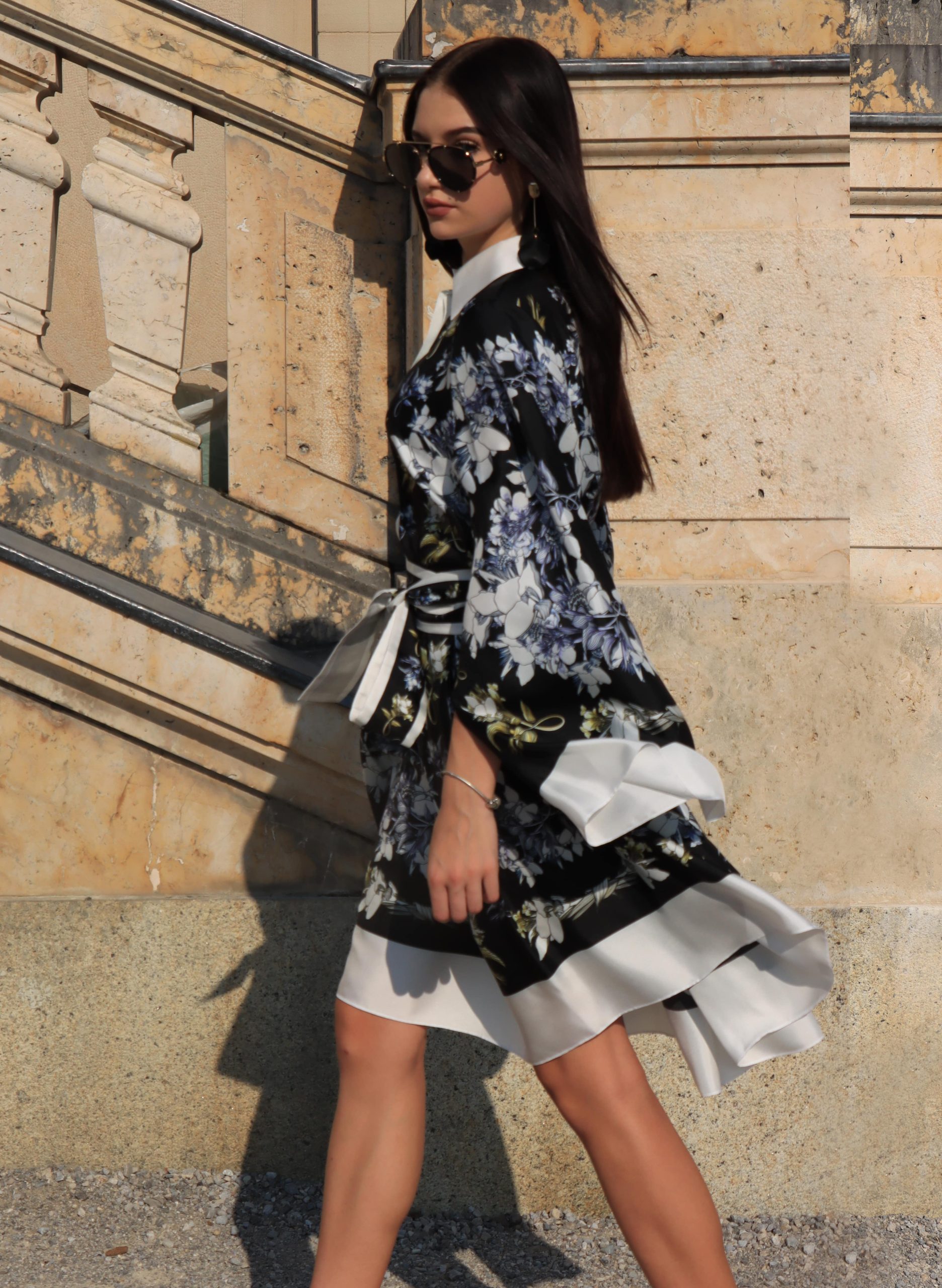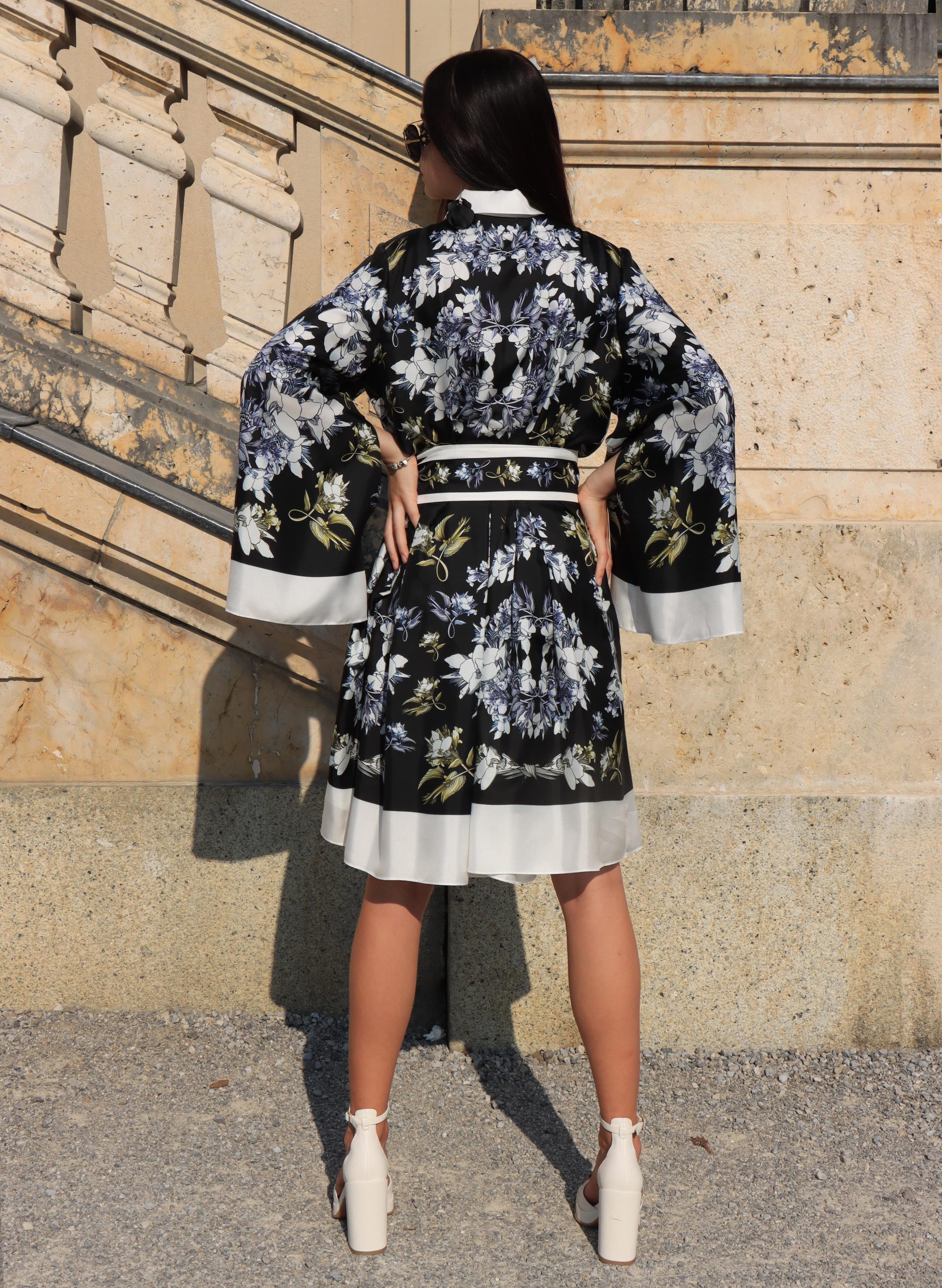 Елегантний комір і пояс підкреслюють талію, надаючи образу витонченості, а східні рукави стають головною акцентною деталлю. Ця сукня точно не залишиться без уваги і легко стане ключовим елементом вашого гардеробу.