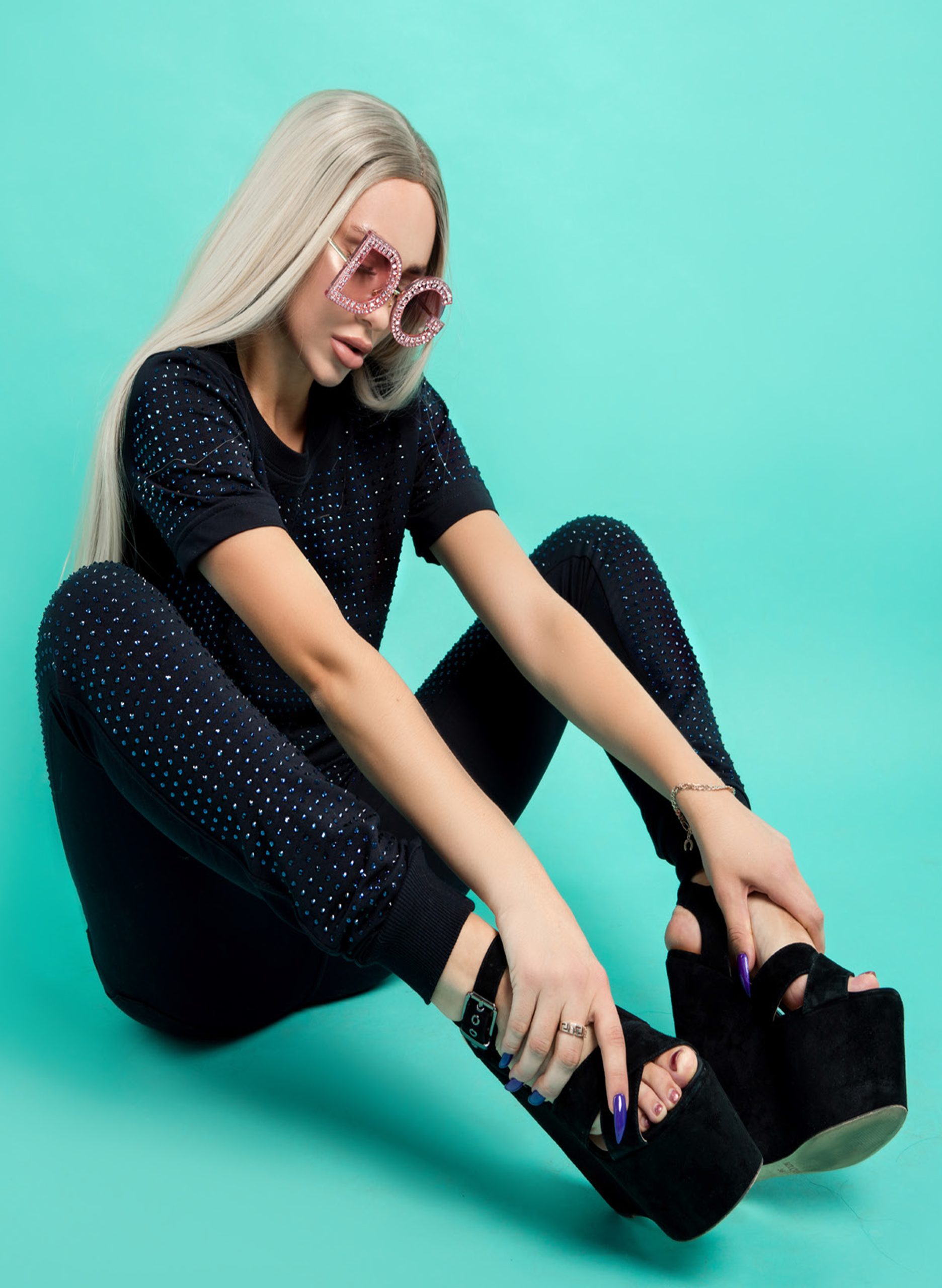 A dark grey tracksuit made from natural Italian cotton, featuring decorative black crystal appliqués from Farufsky.