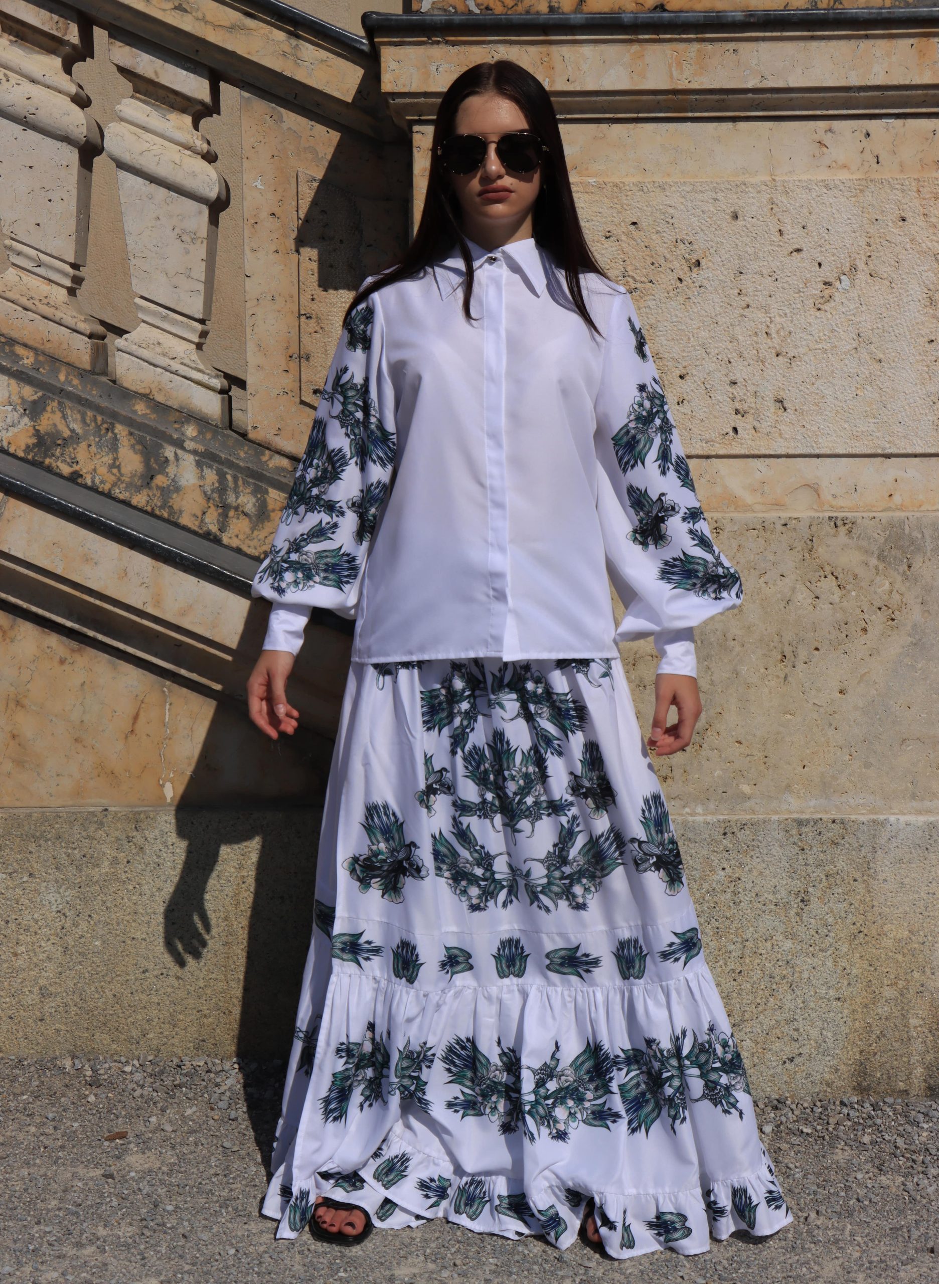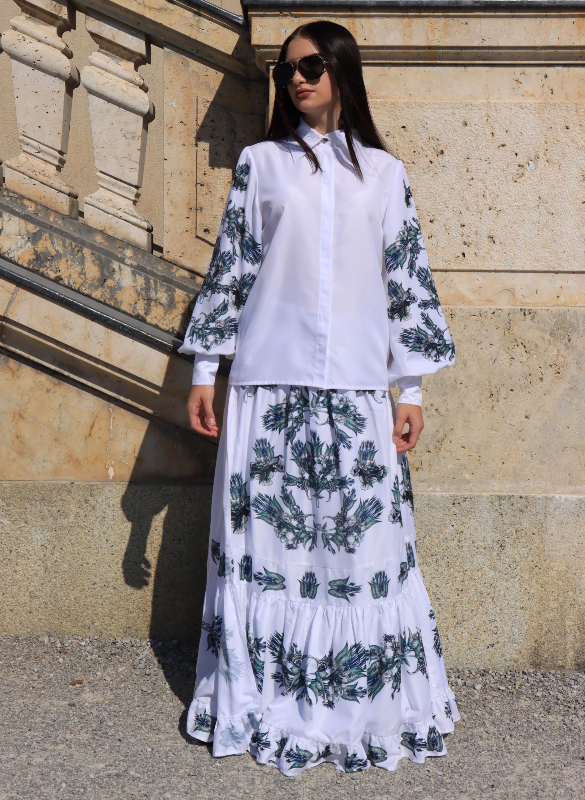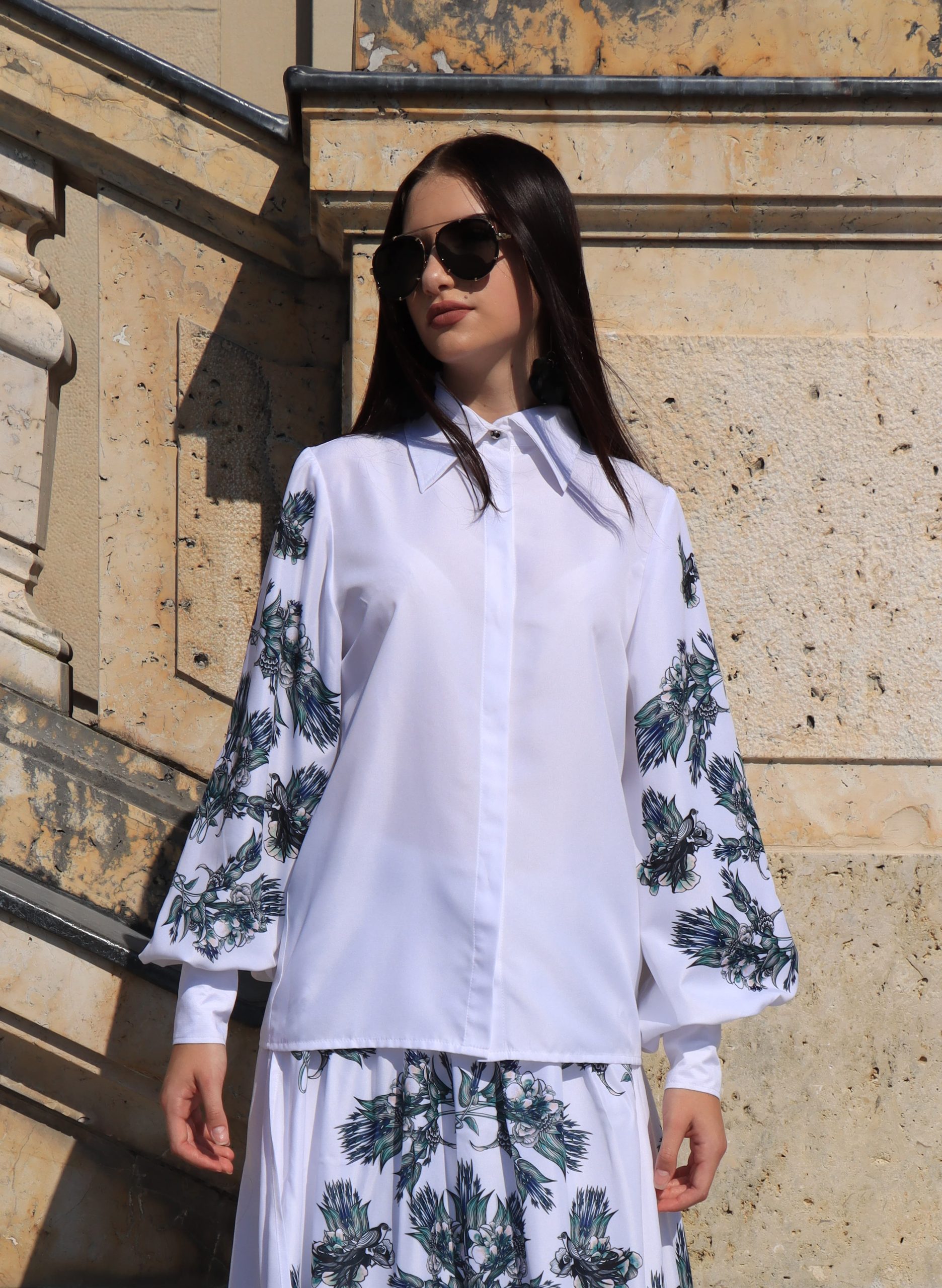 This white shirt, made from fine Italian cotton, is light, feminine, and romantic. The voluminous sleeves feature a cascade of soft gathers and a delicate printed design, cinched at the wrist with tall, elegant cuffs.