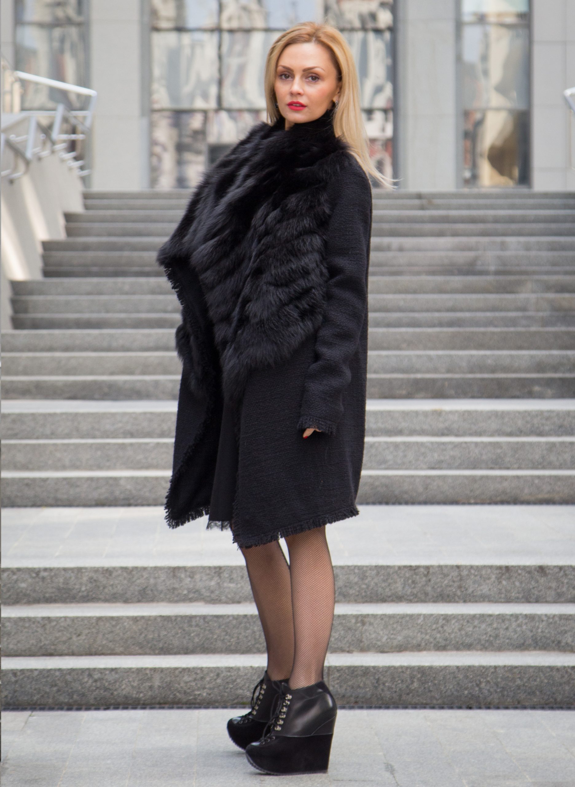This beige wool jacket in Ethno style is a true statement piece — featuring an asymmetrical closure, slits on the sleeves, and adorned with lace and luxurious fur.