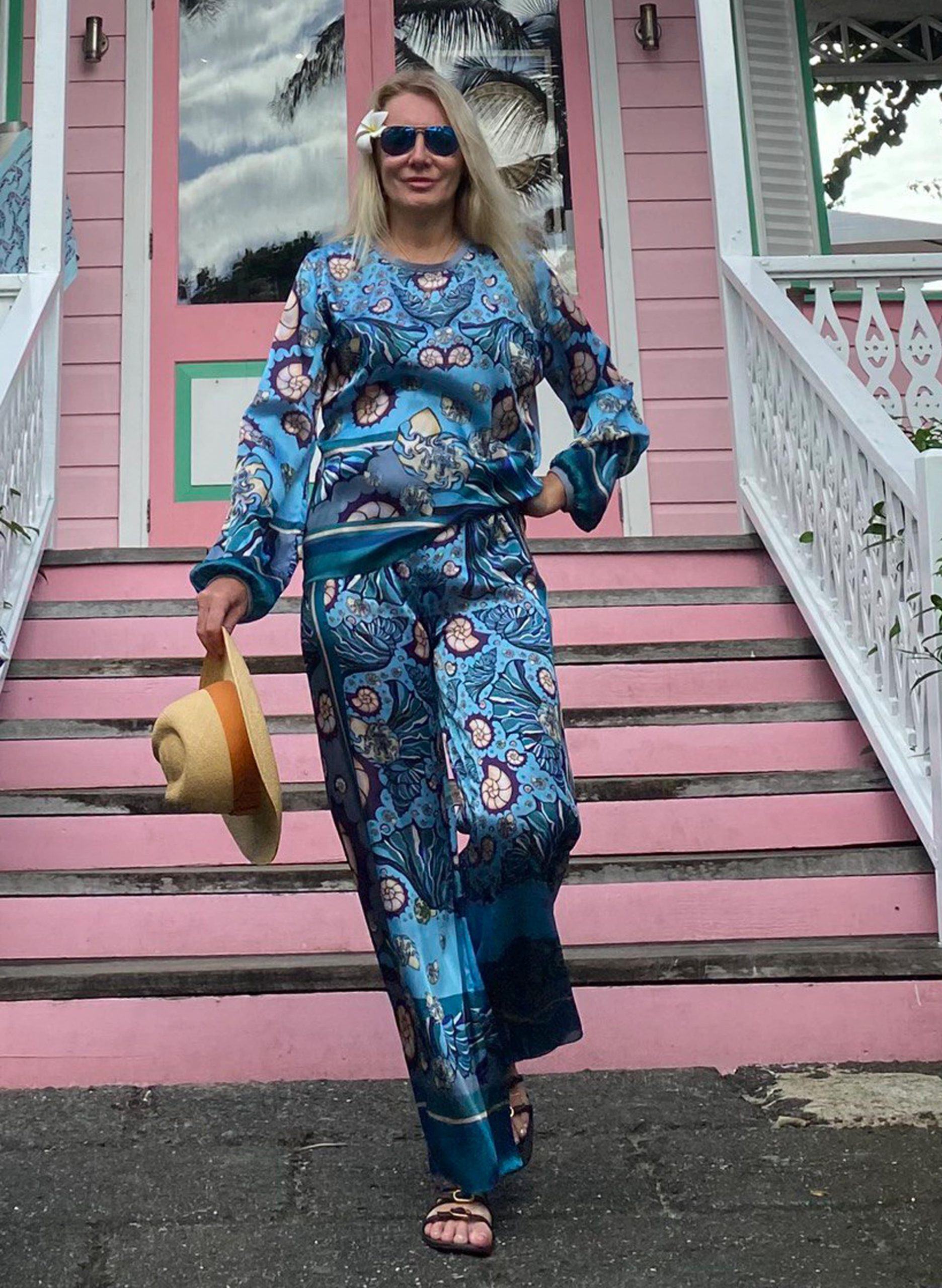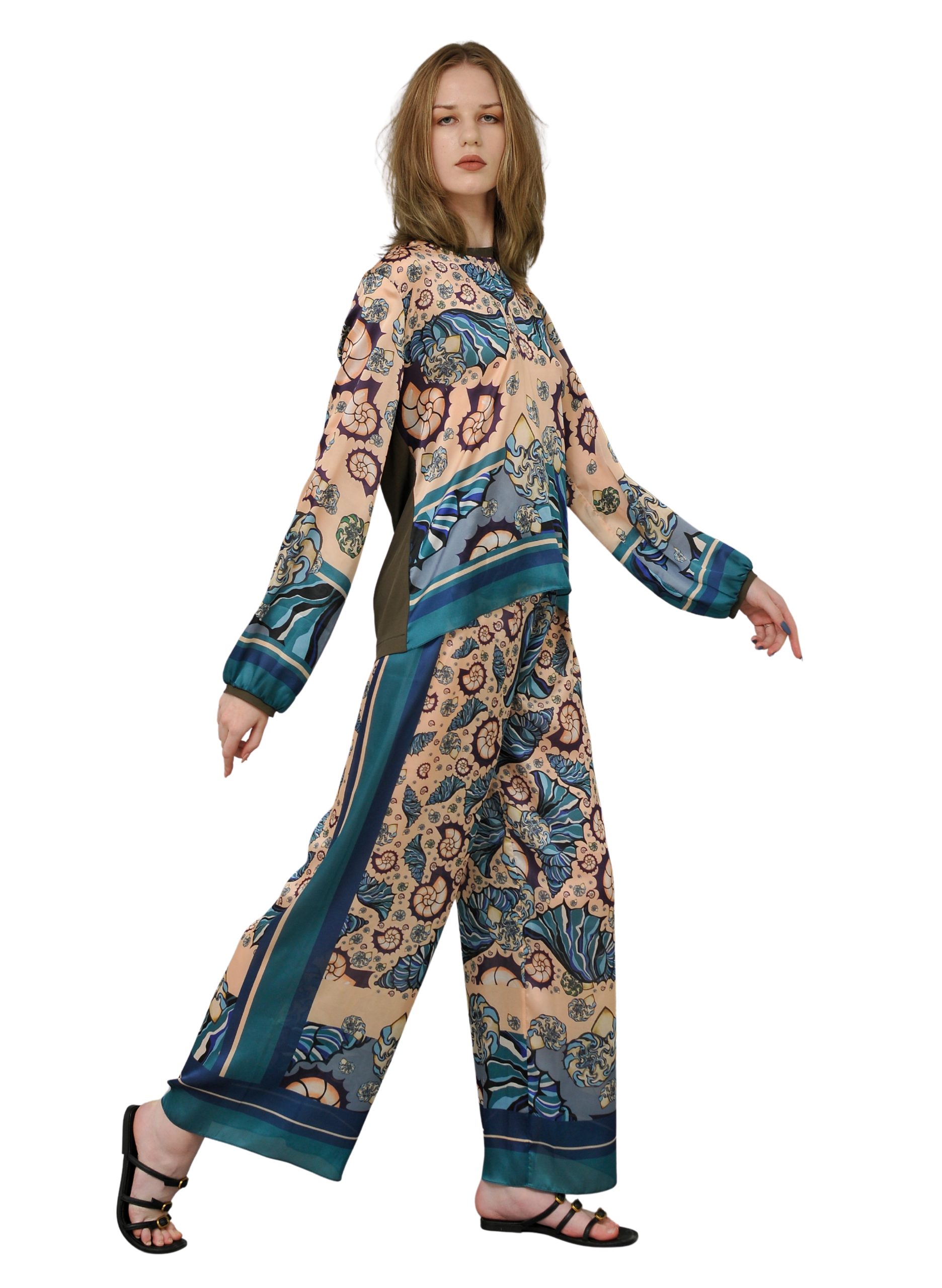 Beige flowing summer trousers with an original marine print — the perfect choice for hot days. Their wide silhouette and lightweight fabric offer a sense of freedom and comfort, whether you’re strolling along the beach or walking through the city.