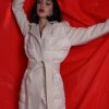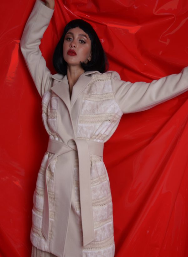 This white wool coat, crafted from premium Italian wool, features delicate lace and luxurious fur accents on the front — a masterpiece of warmth and style.