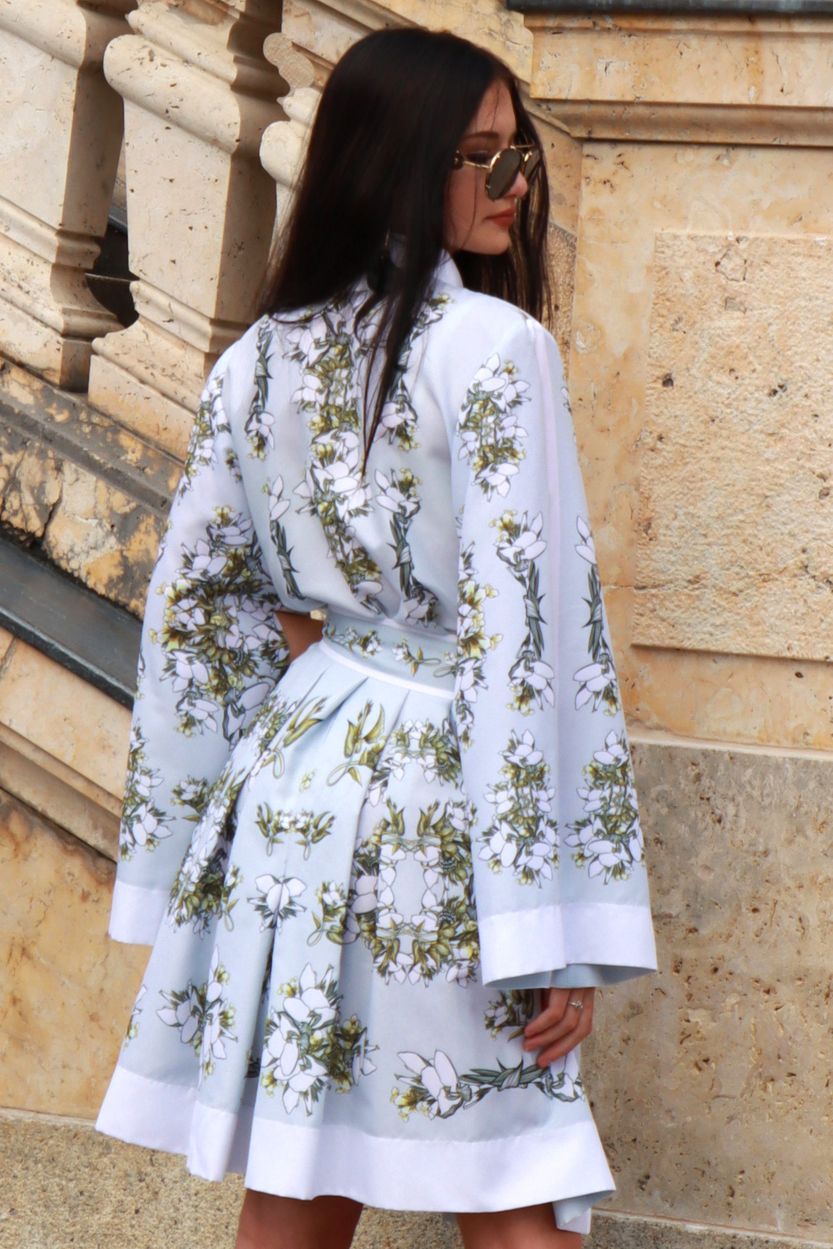 Елегантний комір і пояс підкреслюють талію, надаючи образу витонченості, а східні рукави стають головною акцентною деталлю.
